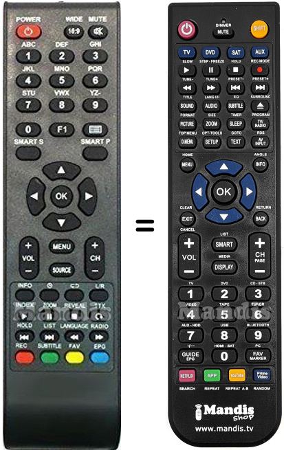 Below, we will show you the correspondence between each button on the original remote control and the button that performs the same function on the replacement remote control. In some cases, you may need to press the SHIFT key before pressing another button to perform certain actions. These additional functions are often not widely used and are included to facilitate understanding of the replacement remote control, or because the original remote control has more buttons than its equivalent.