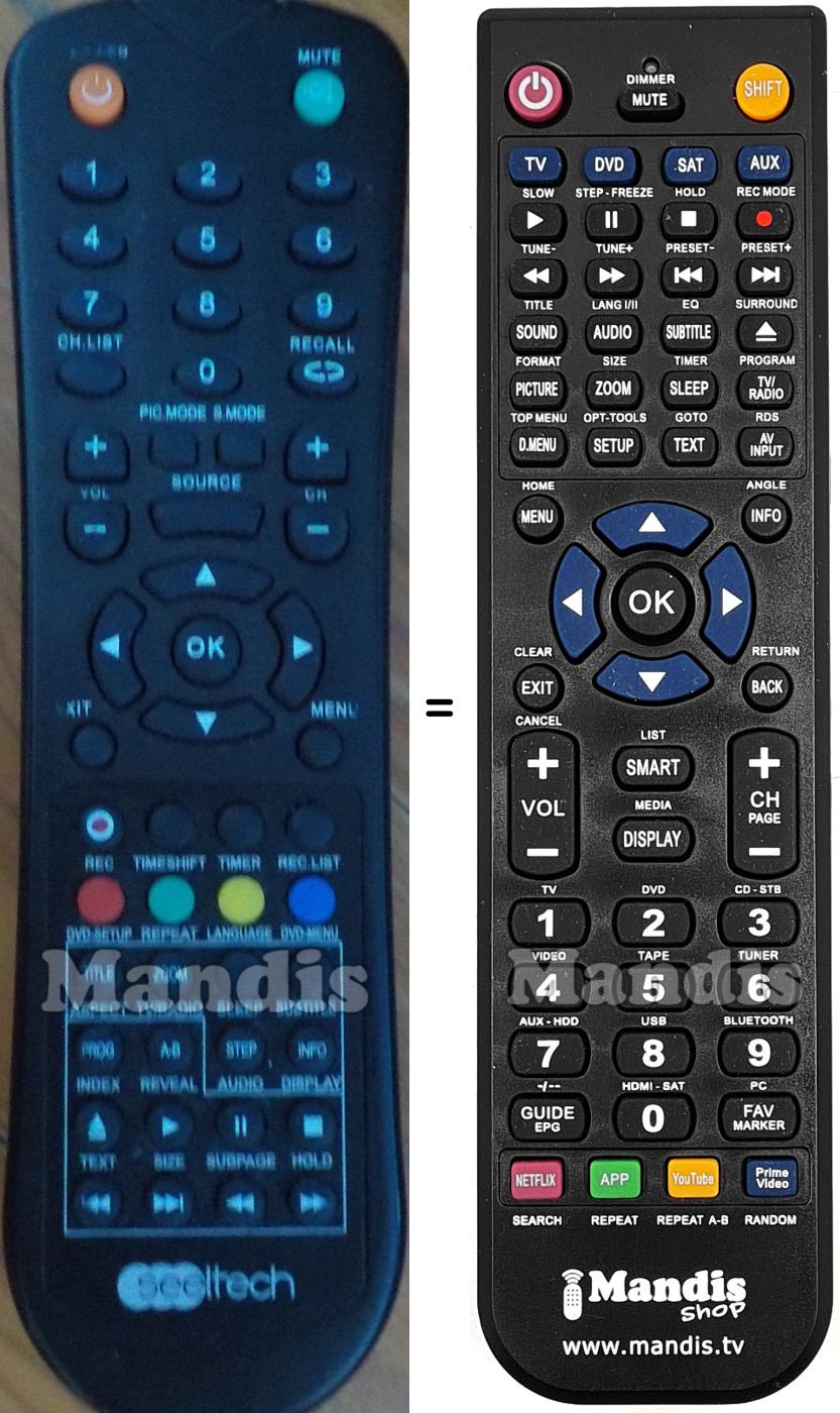 Below, we will show you the correspondence between each button on the original remote control and the button that performs the same function on the replacement remote control. In some cases, you may need to press the SHIFT key before pressing another button to perform certain actions. These additional functions are often not widely used and are included to facilitate understanding of the replacement remote control, or because the original remote control has more buttons than its equivalent.