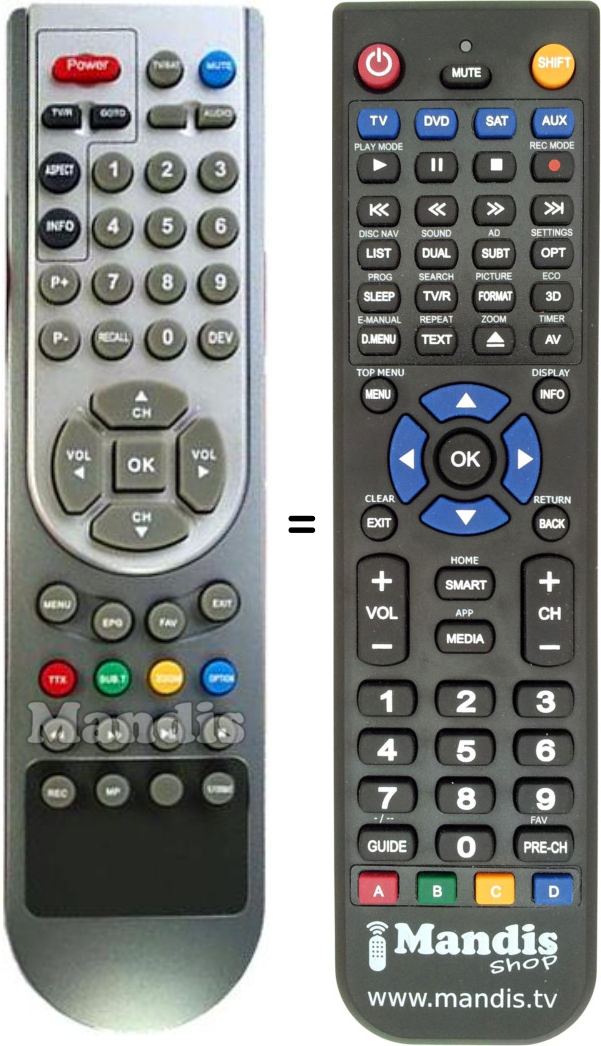 Below, we will show you the correspondence between each button on the original remote control and the button that performs the same function on the replacement remote control. In some cases, you may need to press the SHIFT key before pressing another button to perform certain actions. These additional functions are often not widely used and are included to facilitate understanding of the replacement remote control, or because the original remote control has more buttons than its equivalent.