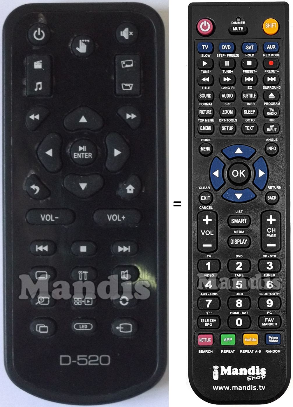This remote control fully replaces your D520 and offers all the functions of the original.