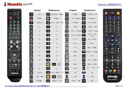 This remote control performs all the functions of the original remote control: TV, DVD, STB, CABLE, VCR, Power, Source, 1, 2, 3, 4, 5, 6, 7, 8, 9, 0, -/--, Pre-Ch, TV / DTV, CH. Mgr., D.Menu, TV / Radio, << REW, Stop, Play / Pause, FF >>, Vol +, Vol -, Mute, P +, P -, Menu, Exit, Up, Right, Down, Left, Enter / OK, Guide, Info, TTX / Mix, Red, Green, Yellow, Blue, PIP, Dual I-II, Still, Subtitle, Text, Back, Alt, APP