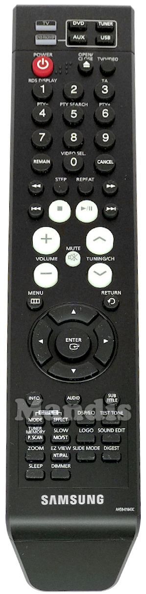 TV, DVD Receiver, DVD, Tuner, Aux, USB, Power, Open / Close, TV / Video, 1 / RDS Display, 2, 3 / TA, 4 / PTY -, 5 / PTY Search, 6 / PTY +, 7, 8, 9, 0 / Video Sel., Remain, Cancel, <<, Step, Repeat, >>, I<<, Stop, Play / Pause, >>I, Volume +, Volume -, Mute, Tuning + / CH +, Tuning - / CH -, Menu, Return, Up, Right, Down, Left, Enter, Info, Audio, Sub Title, Dolby PL II Mode, Dolby PL II Effect, DSP/EQ, Test Mode, P.Scan / Tuner Memory, Mo/St / Slow, Logo, Sound Edit, Zoom, NT/PAL / Ez View, Slide Mode, Digest, Sleep, Dimmer