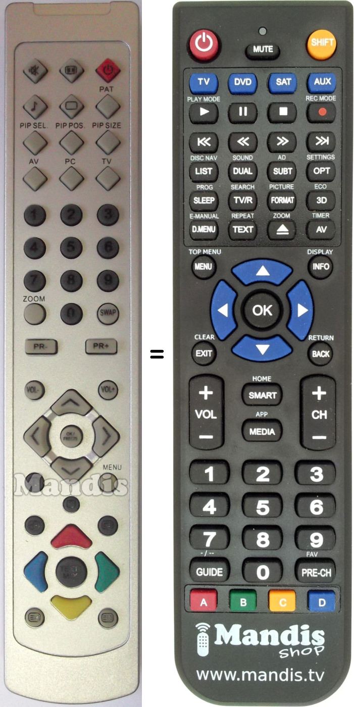 Below, we will show you the correspondence between each button on the original remote control and the button that performs the same function on the replacement remote control. In some cases, you may need to press the SHIFT key before pressing another button to perform certain actions. These additional functions are often not widely used and are included to facilitate understanding of the replacement remote control, or because the original remote control has more buttons than its equivalent.