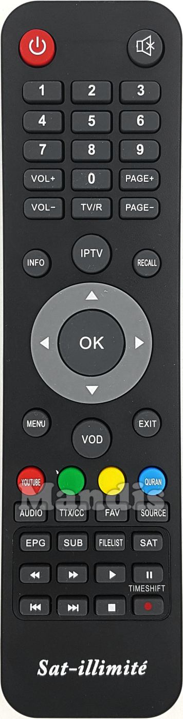 Power, Mute, 1, 2, 3, 4, 5, 6, 7, 8, 9, 0, Vol+, Vol-, TV/R, Page+, Page-, Info, IPTV, Recall, Up, Left, OK, Right, Down, Menu, VOD, Exit, Red / Youtube, Green, Yellow, Blue / Quran, Audio, TTX/CC, FAV, Source, EPG, SUB, Filelist, SAT, <<, >>, Play, Pause, I<<, >>I, Stop, Rec / Timeshift
