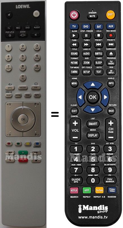 Below, we will show you the correspondence between each button on the original remote control and the button that performs the same function on the replacement remote control. In some cases, you may need to press the SHIFT key before pressing another button to perform certain actions. These additional functions are often not widely used and are included to facilitate understanding of the replacement remote control, or because the original remote control has more buttons than its equivalent.