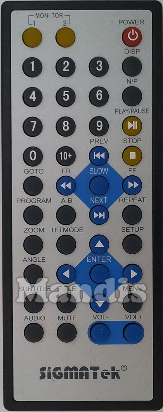 Monitor 1, Monitor 2, Power, DISP, N/P, Play/Pause, Stop, 1, 2, 3, 4, 5, 6, 7, 8, 9, 0, 10+, I<< PREV, >>I NEXT, << FR, >> FF, Slow, GOTO, Program, A-B, Repeat, Zoom, TFT Mode, Setup, Angle, Subtitle, Audio, Title, Mute, Vol-, Vol+, Up, Down, Left, Right, Enter, Menu