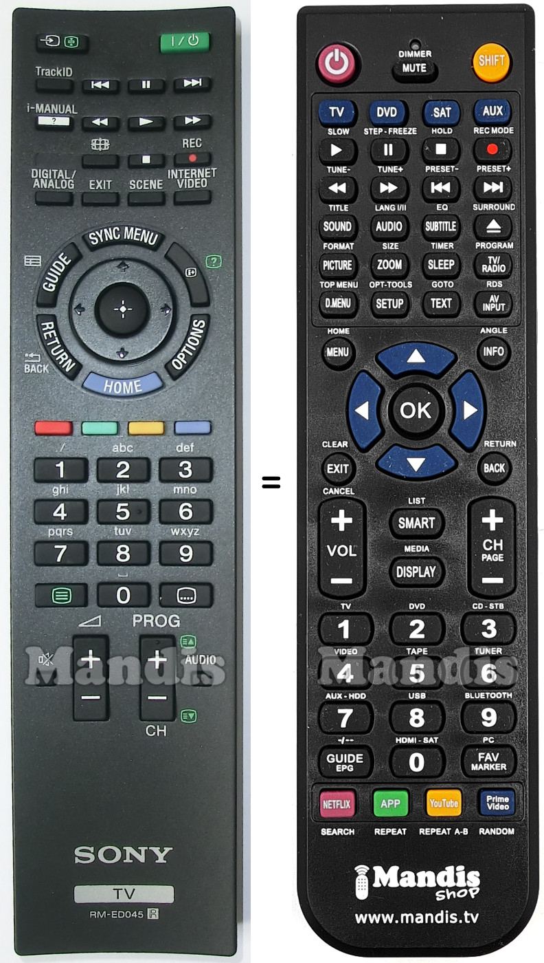This remote control performs all the functions of the original remote control: SOURCE, POWER, TRACK ID, I<<, PAUSE, >>I, I-MANUAL, <<, PLAY, >>, [+], STOP, REC, DIGITAL/ANALOG, EXIT, SCENE, INTERNET VIDEO, OK, UP, DOWN, LEFT, RIGHT, SYNC MENU, HOME, [I+]/[?], OPTIONS, GUIDE, RETURN/BACK, RED, GREEN, YELLOW, BLUE, 1, 2, 3, 4, 5, 6, 7, 8, 9, 0, [≡], [...], VOL+, VOL-, MUTE, Prog/CH+, Prog/CH-, AUDIO