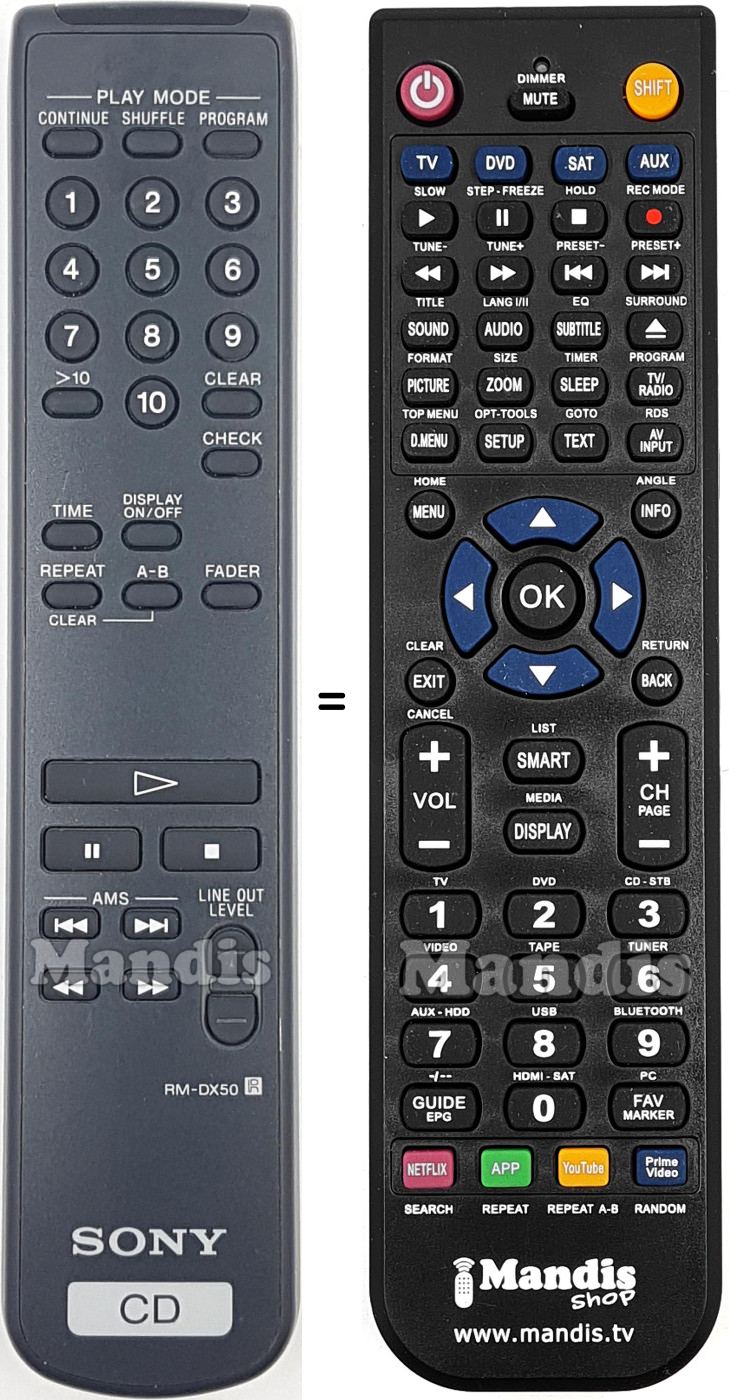Below, we will show you the correspondence between each button on the original remote control and the button that performs the same function on the replacement remote control. In some cases, you may need to press the SHIFT key before pressing another button to perform certain actions. These additional functions are often not widely used and are included to facilitate understanding of the replacement remote control, or because the original remote control has more buttons than its equivalent.