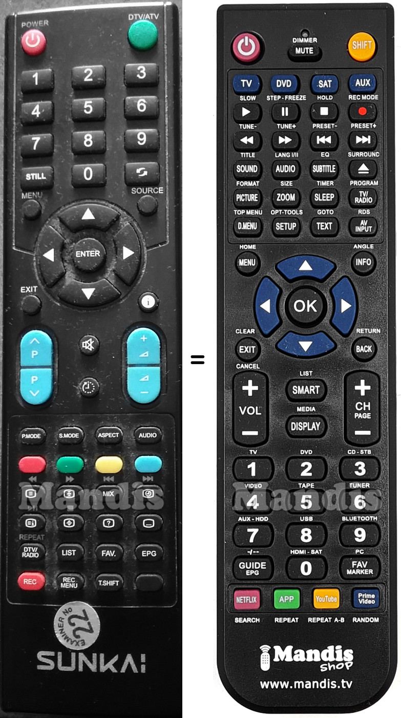 Below, we will show you the correspondence between each button on the original remote control and the button that performs the same function on the replacement remote control. In some cases, you may need to press the SHIFT key before pressing another button to perform certain actions. These additional functions are often not widely used and are included to facilitate understanding of the replacement remote control, or because the original remote control has more buttons than its equivalent.