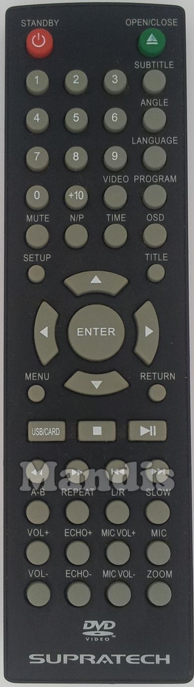 Power/Standby, Open/Close, 1, 2, 3, 4, 5, 6, 7, 8, 9, 0, +10, Subtitle, Angle, Language, Video, Program, Mute, N/P, Time, OSD, Setup, Title, Up, Down, Left, Right, Enter, Menu, Return, USB/Card, Stop, Play/Pause, <<, >>, I<<, >>I, A-B, Repeat, L/R, Slow, Vol+, Echo+, Mic Vol+, MIC, Vol-, Echo-, MIC Vol-, Zoom