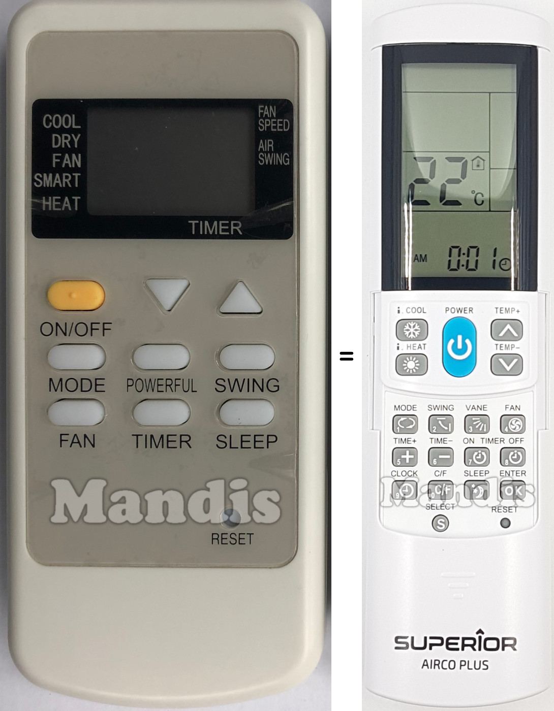 My LG air-conditioner's remote died and need replacement. AircoPlus did the job. I should point out that the code match did not correspond according to manufacturer's table. Let the auto-search code set up do the work. Also, excellent service by Mandis Remotes with a well-protected package.