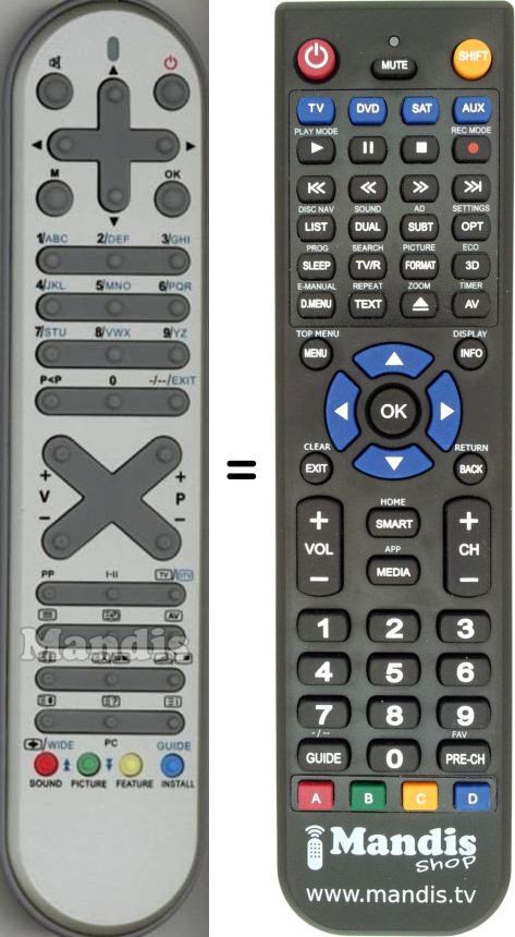 Below, we will show you the correspondence between each button on the original remote control and the button that performs the same function on the replacement remote control. In some cases, you may need to press the SHIFT key before pressing another button to perform certain actions. These additional functions are often not widely used and are included to facilitate understanding of the replacement remote control, or because the original remote control has more buttons than its equivalent.