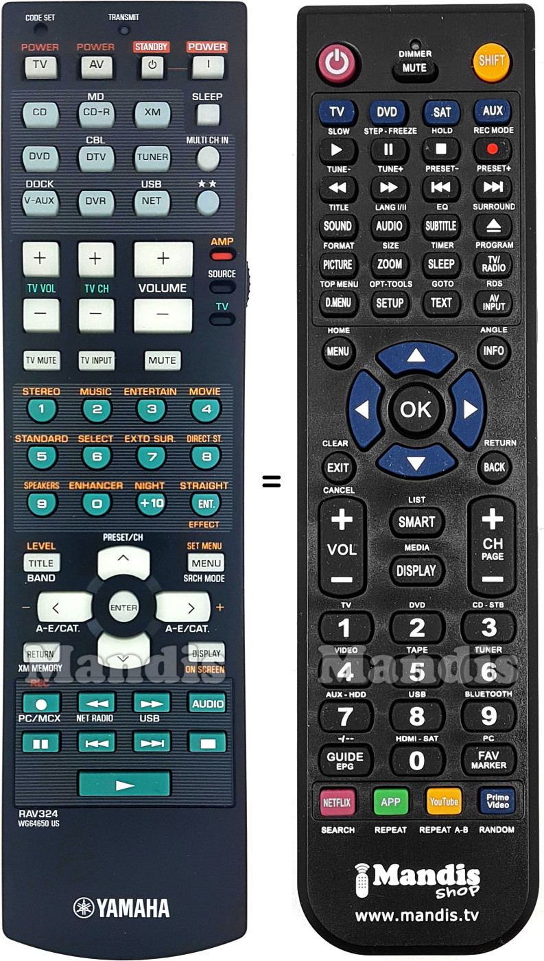 This remote control performs all the functions of the original remote control: Power TV, Power AV, Standby, Power, CD, CD-R / MD, XM, DVD, DTV / CBL, TUNER, V-AUX / DOCK, DVR, NET / USB, Sleep, Multi CH IN, ★★, TV Vol+, TV Vol-, TV CH+, TV CH-, Volume+, Volume-, TV Mute, TV Input, Mute, Stereo / 1, Music / 2, Entertain / 3, Movie / 4, Standard / 5, Select / 6, Extd Sur. / 7, Direct ST / 8, Speakers / 9, Enhancer / 0, Night / +10, Straight / Effect / Ent, Level / Title / Band, Set Menu / Menu / Srch Mode, Up / Preset/CH+, Left / A-E/Cat.-, Enter, Right / + / A-E/Cat., Down / PReset/CH-, DAB Memory / Return, On Screen / Display, Rec / PC/MCX, << / Net Radio, >> / USB, Audio, Pause / Preq/Text, I<< / PTY Seek Mode, >>I / PTY Seek Start, Stop / EON, Play